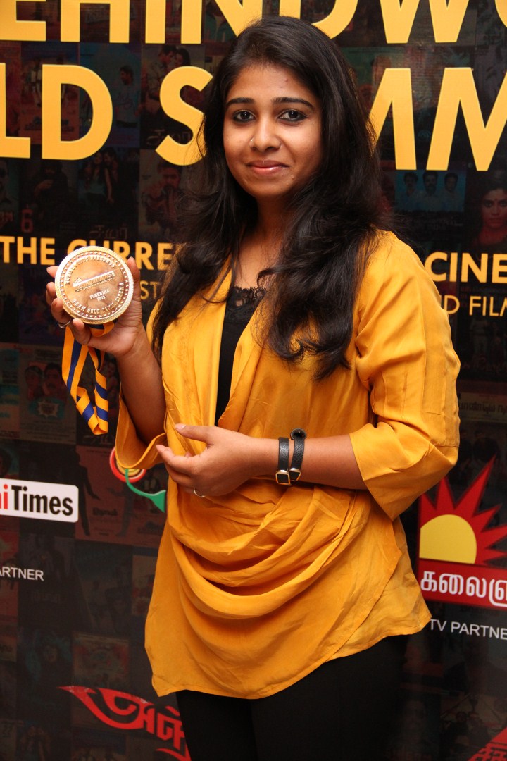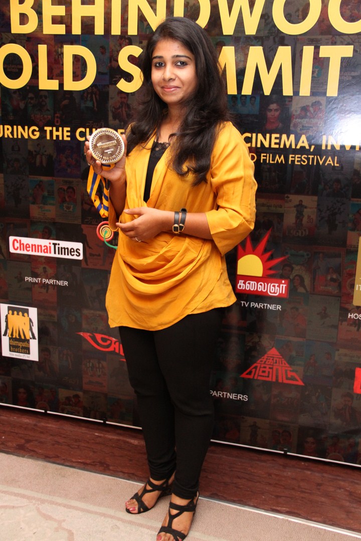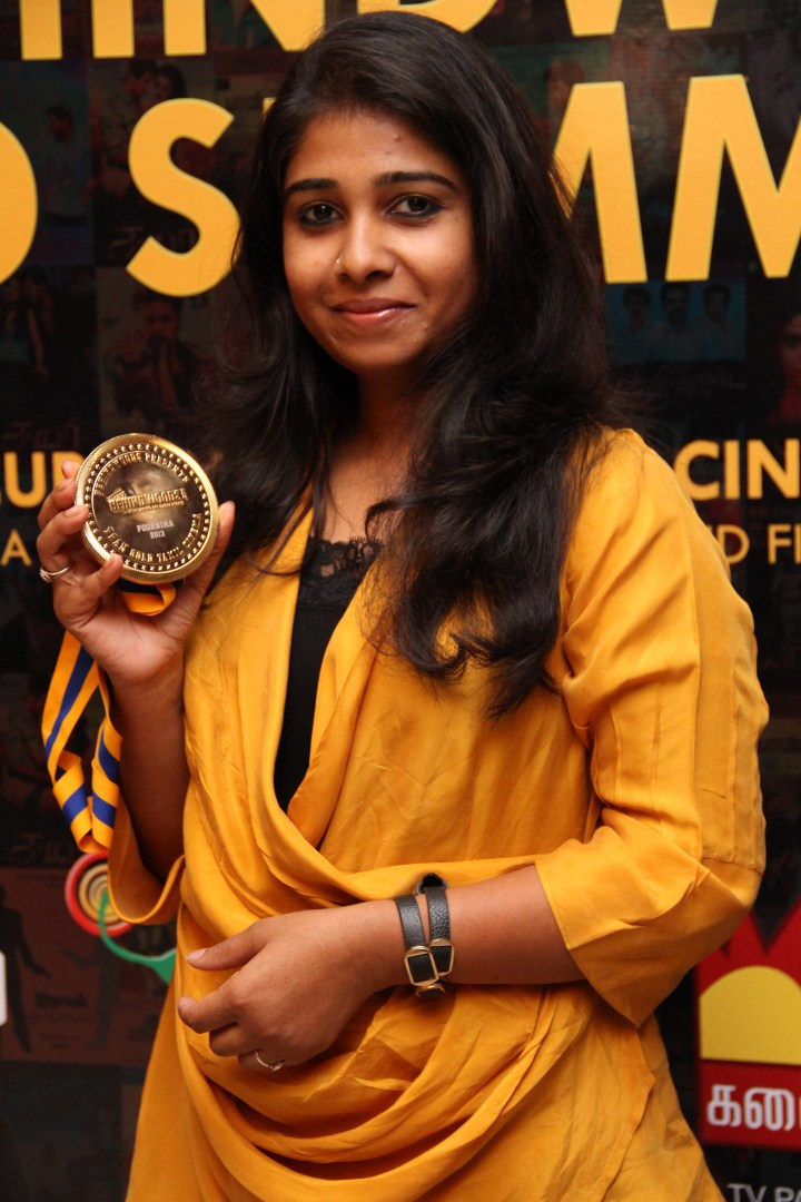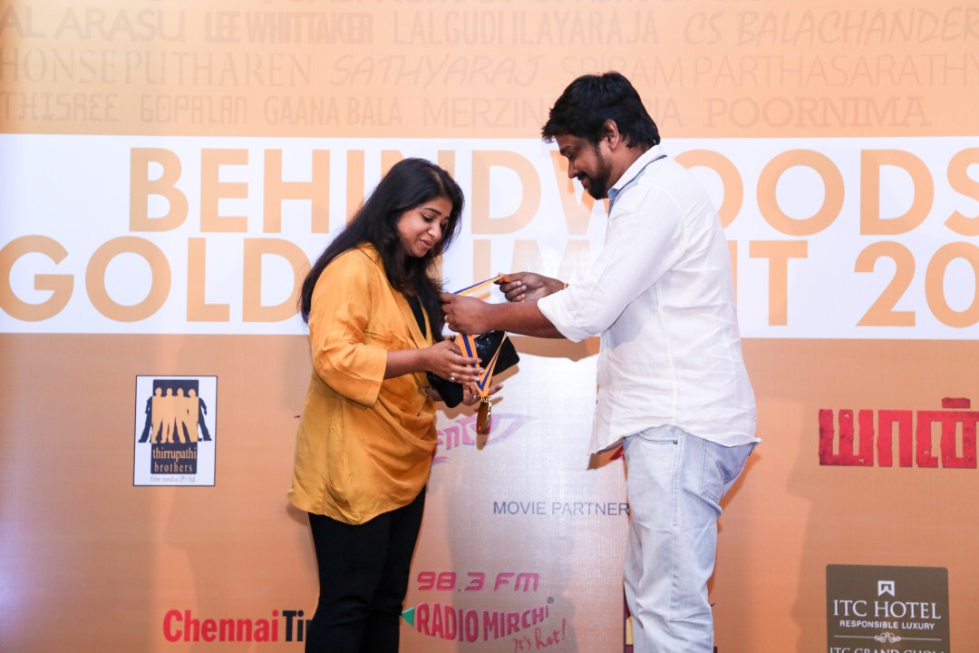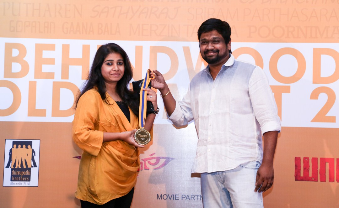 Poornima won the Behindwoods Gold Medal for Best Costumes for the movie Paradesi, and she received the medal from director Rajesh.